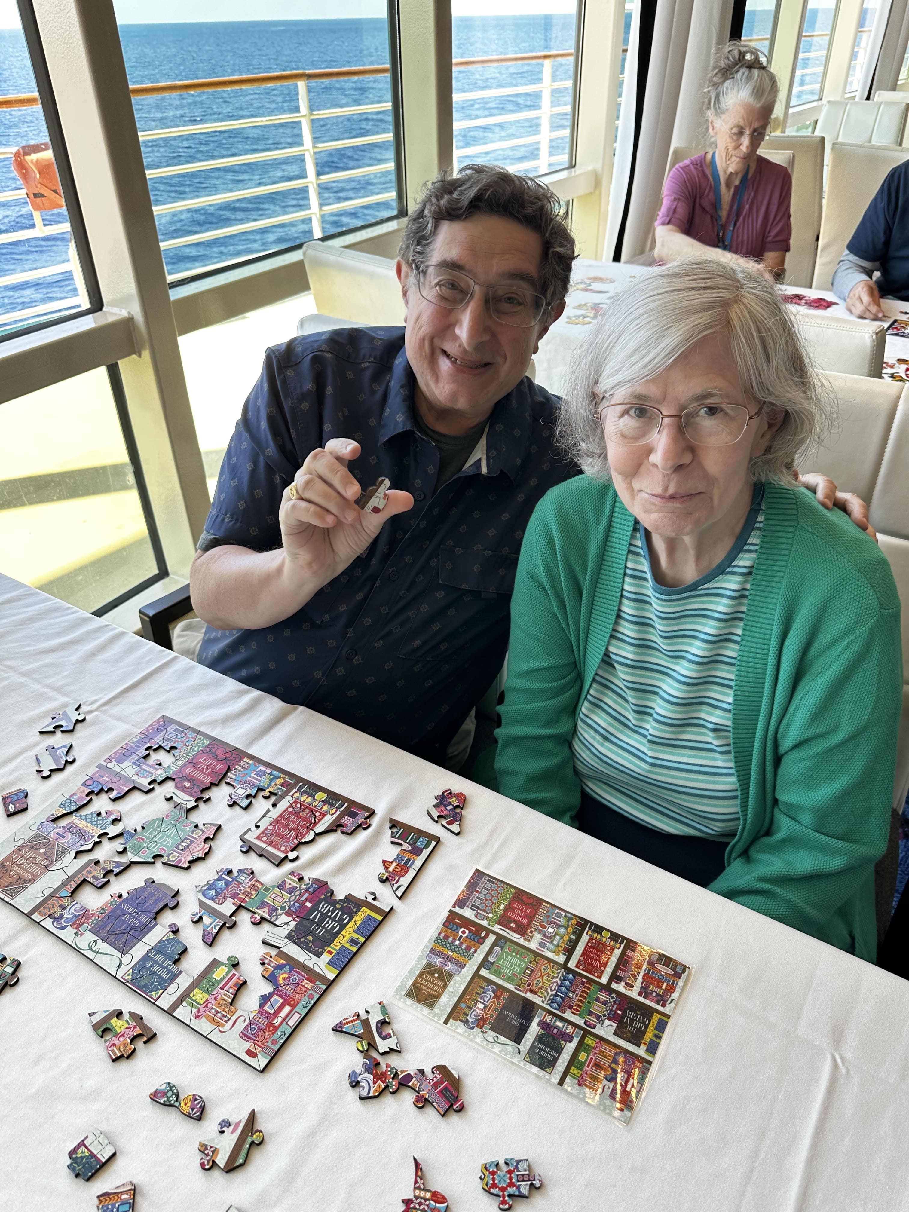 Their hands-on puzzling sessions, held on sea days in the dining room, regularly draw 100+ guests. These drop-in events are relaxed, social, and inclusive—inviting guests of all ages and backgrounds to unwind, connect, and puzzle at their own pace. Monica and Rae bring over 200 puzzles from 30–40 different brands, offering a wide mix of piece counts (from 30 to 1,000), materials (wood, acrylic, cardboard, plastic), and styles—including large-piece, shaped, and boutique designs.